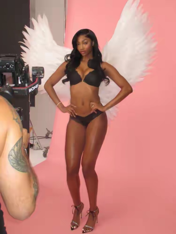 画面中的安吉尔里斯穿着一身黑色蕾丝内搭,背后则背着白色的天使翅膀,而且还踩着恨天高高跟鞋,时不时变换着各种各样的姿势和风格,大胆豪放的动作让不少球迷直言真是大饱眼福。里斯还透露,自己将以个人的名义成为维秘超模秀场上第一个登台亮相的运动员,也算是创造了历史。不少球迷也在期待着里斯的维密T台秀场。